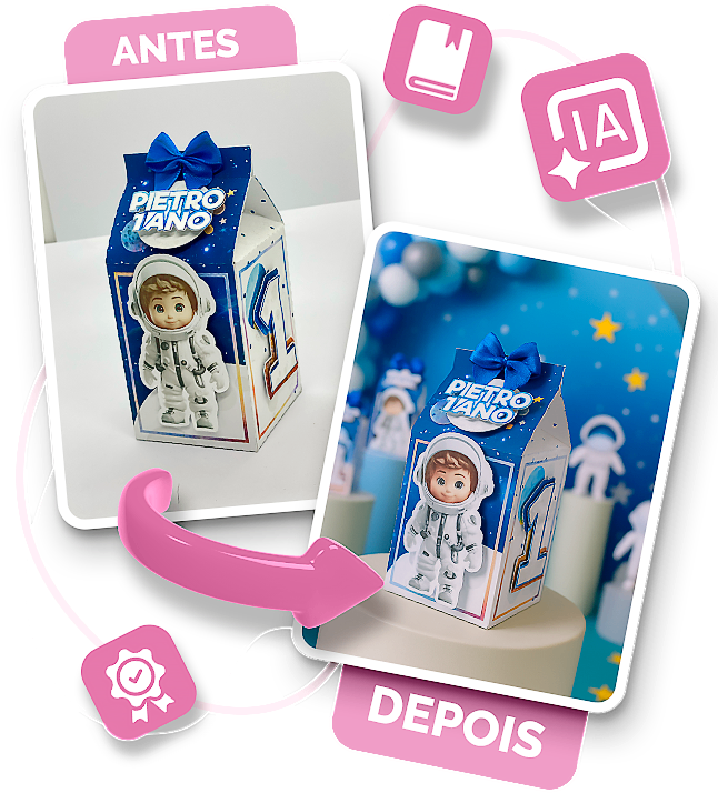 Para quem trabalha com papelaria personalizada, festas, artesanato ou personalizados em geral. Ideal para artesãs, mães festeiras e empreendedoras que querem transformar fotos simples em vitrines profissionais.
